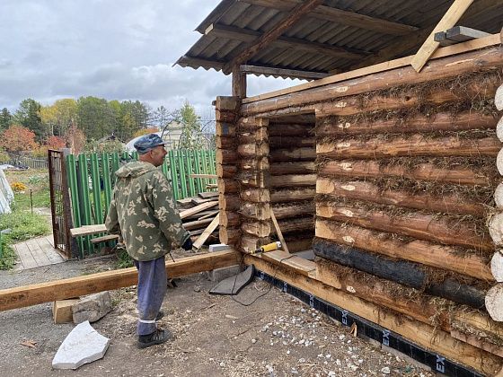 Валерий Горбунов успевает построить каркас бани. Мужчина шкурит бревна, и поэтому его лицо покрыто мелким опилом. Валерий Николаевич рассказал, что прежний дом он купил в 2006 году, и постепенно что-то в нем строил.