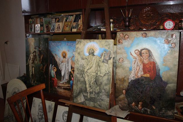 В квартире у 61-летнего Алефтина абсолютный минимализм во всем. Творит хозяин в зале, сидя перед мольбертом, в стойки которого воткнуты несколько кистей разного диаметра. По полкам «ранешной» полированной стенки расставлены иконы. Часть уже закончена, в цвете. Вдоль по полу – те, что пока только в карандаше.