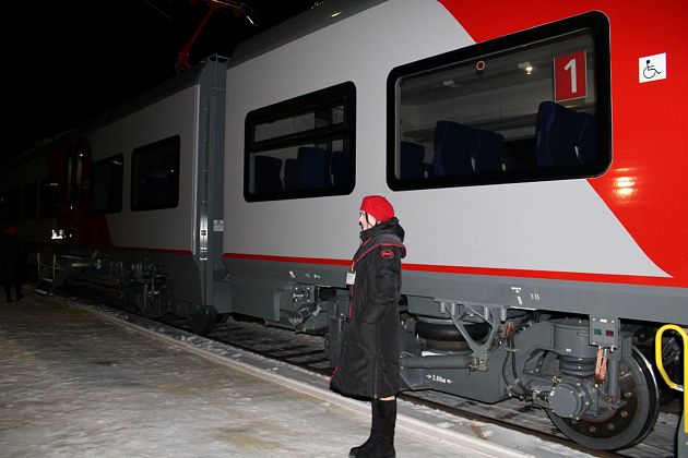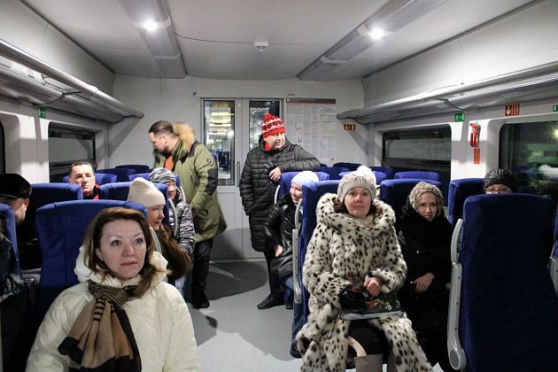 Представители Свердловской пригородной компании подарили первым пассажирам фирменные значки и магниты. Фото: Алла Брославская
