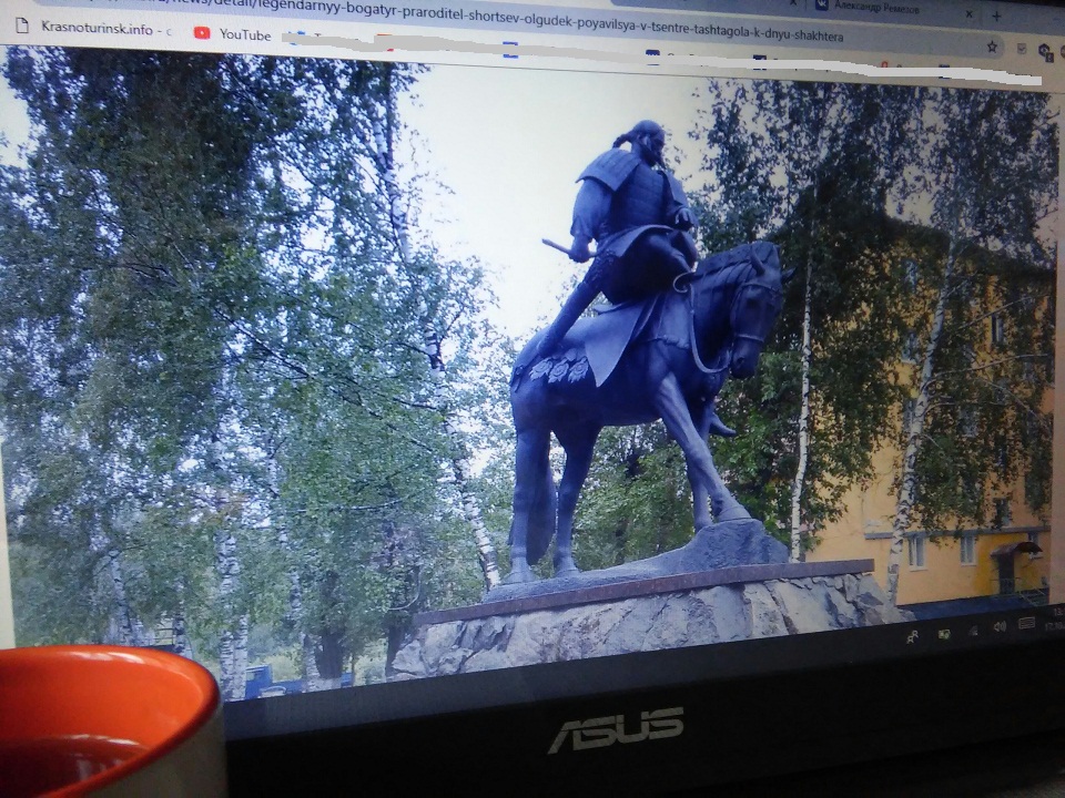 В конце июля на улице Ленина городского поселения Таштагол в Кемеровской области, где проживает около 23 тысяч человек, установили трехметрового бронзового воина Ольгудека, сидящего на коне. Автор — скульптор Олег Ершов.