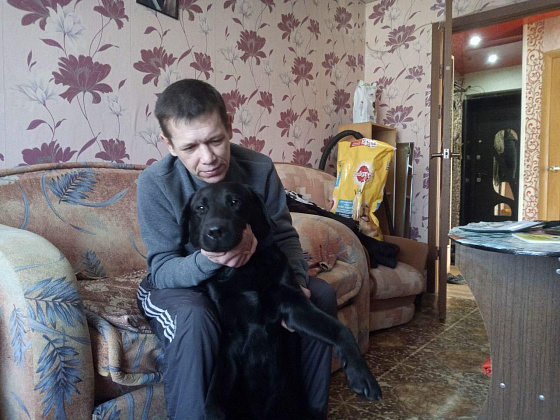 Почти четыре месяца лабрадор живет в квартире вместе с хозяином. По дому ходит за ним хвостиком, по улице, наоборот, является его глазами, идет впереди.